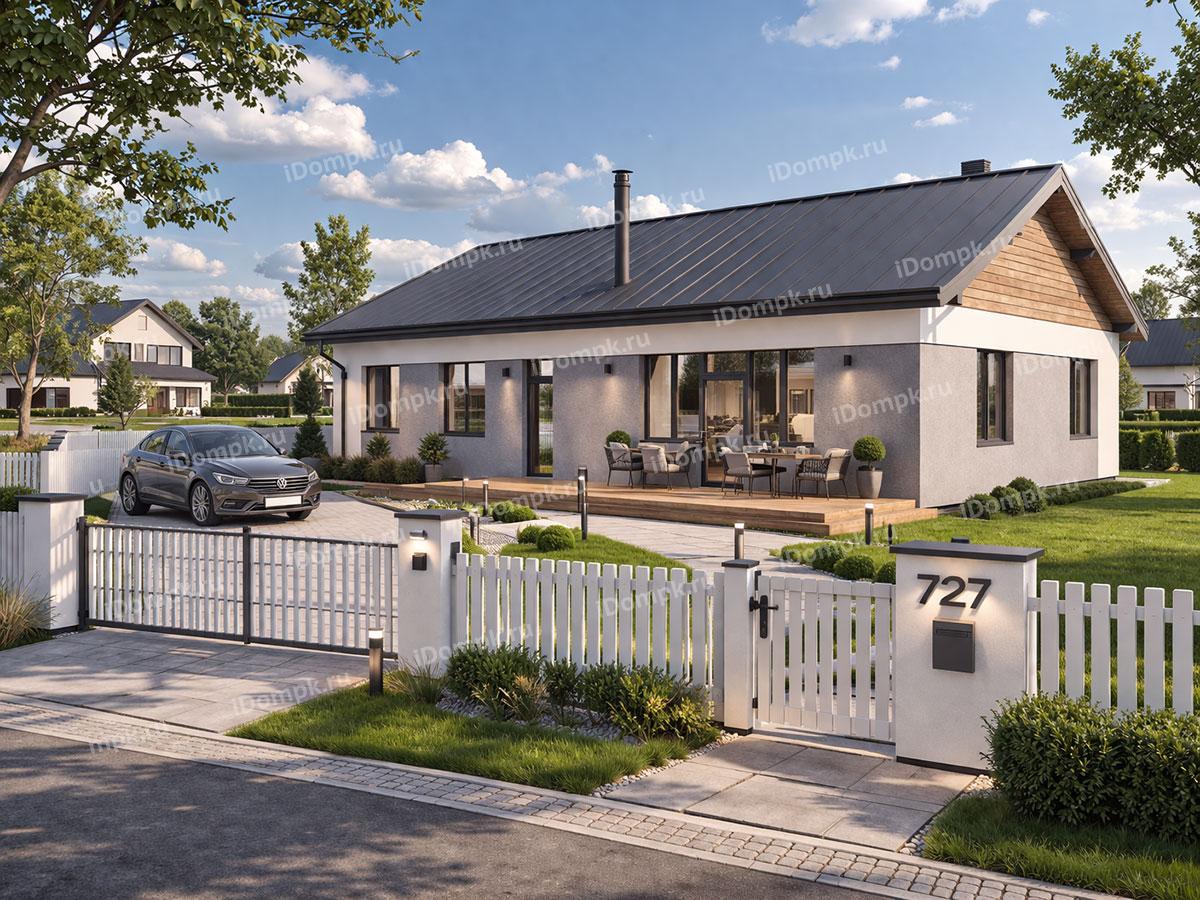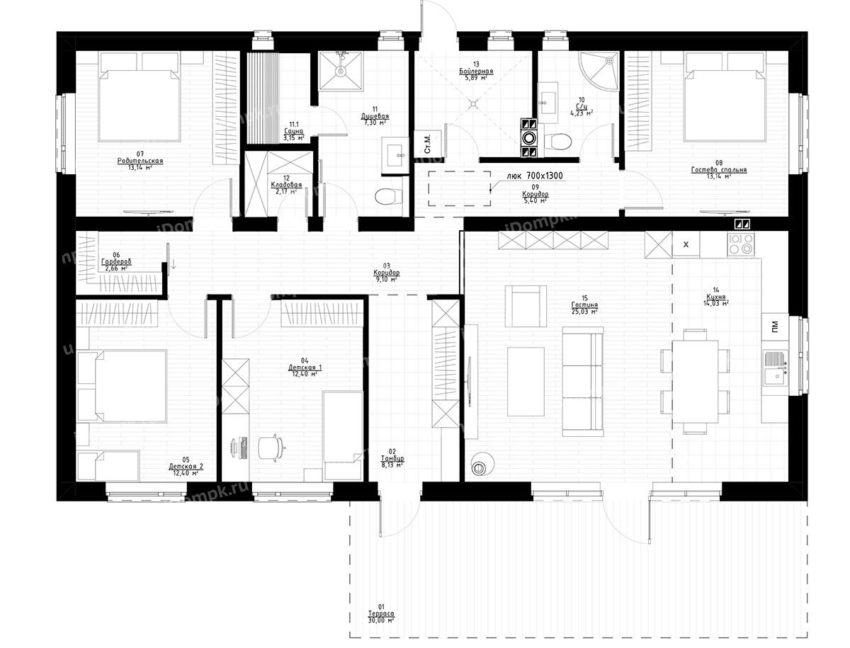 Проект одноэтажного дома с сауной, 4 спальнями и кухней-гостиной