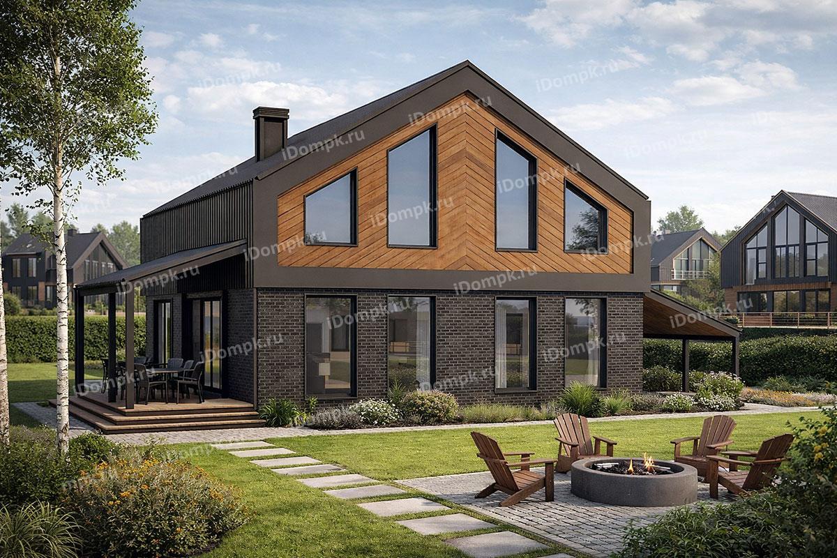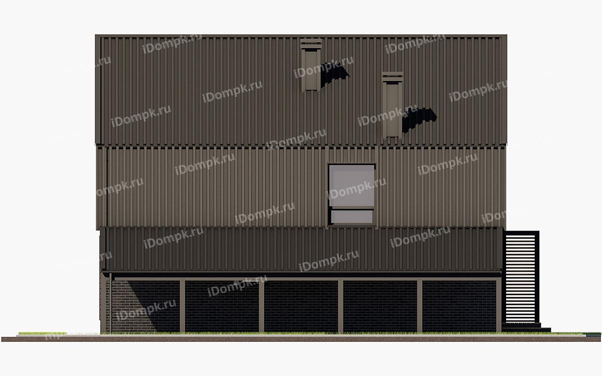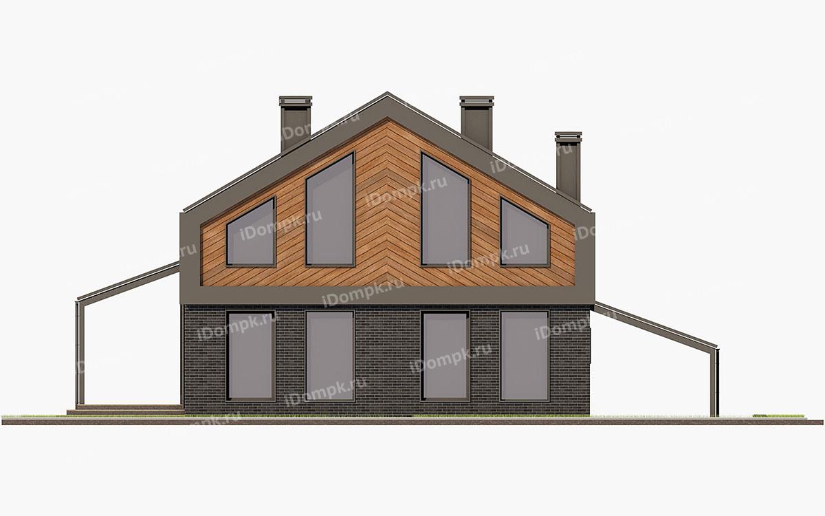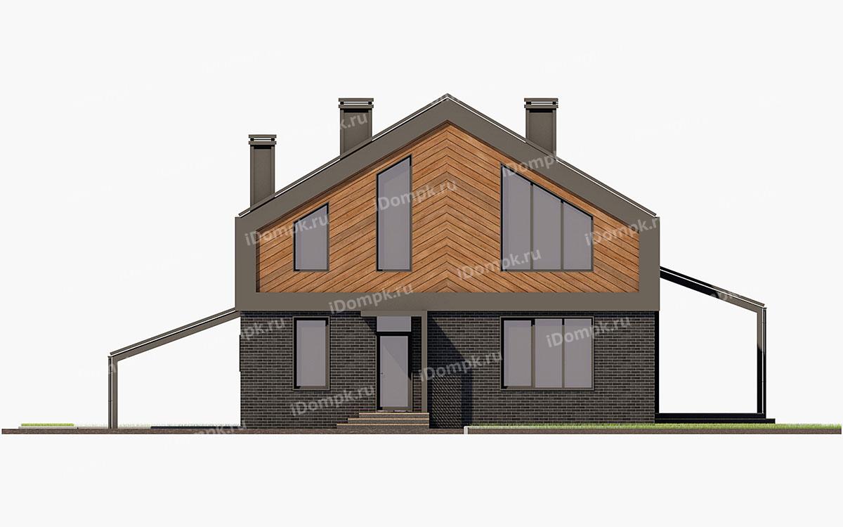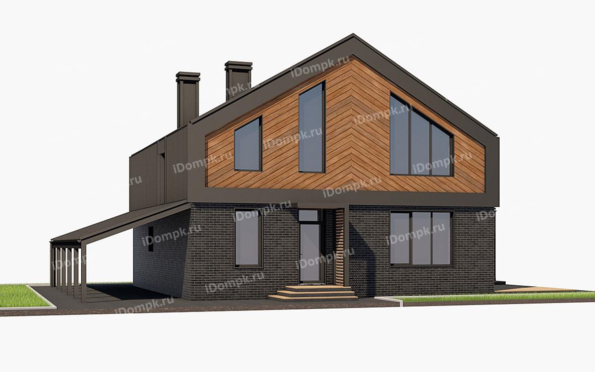 Проект дома с мансардой, 5 спальнями, кабинетом, навесом и террасой