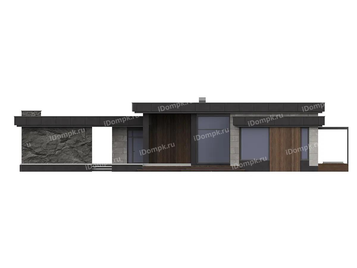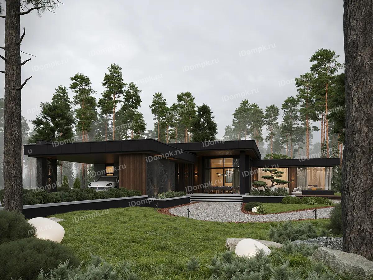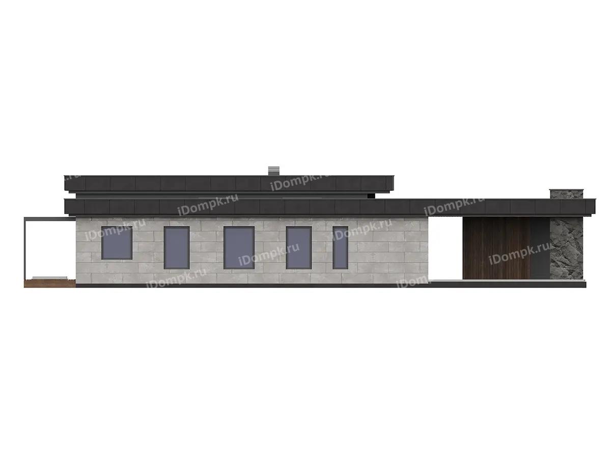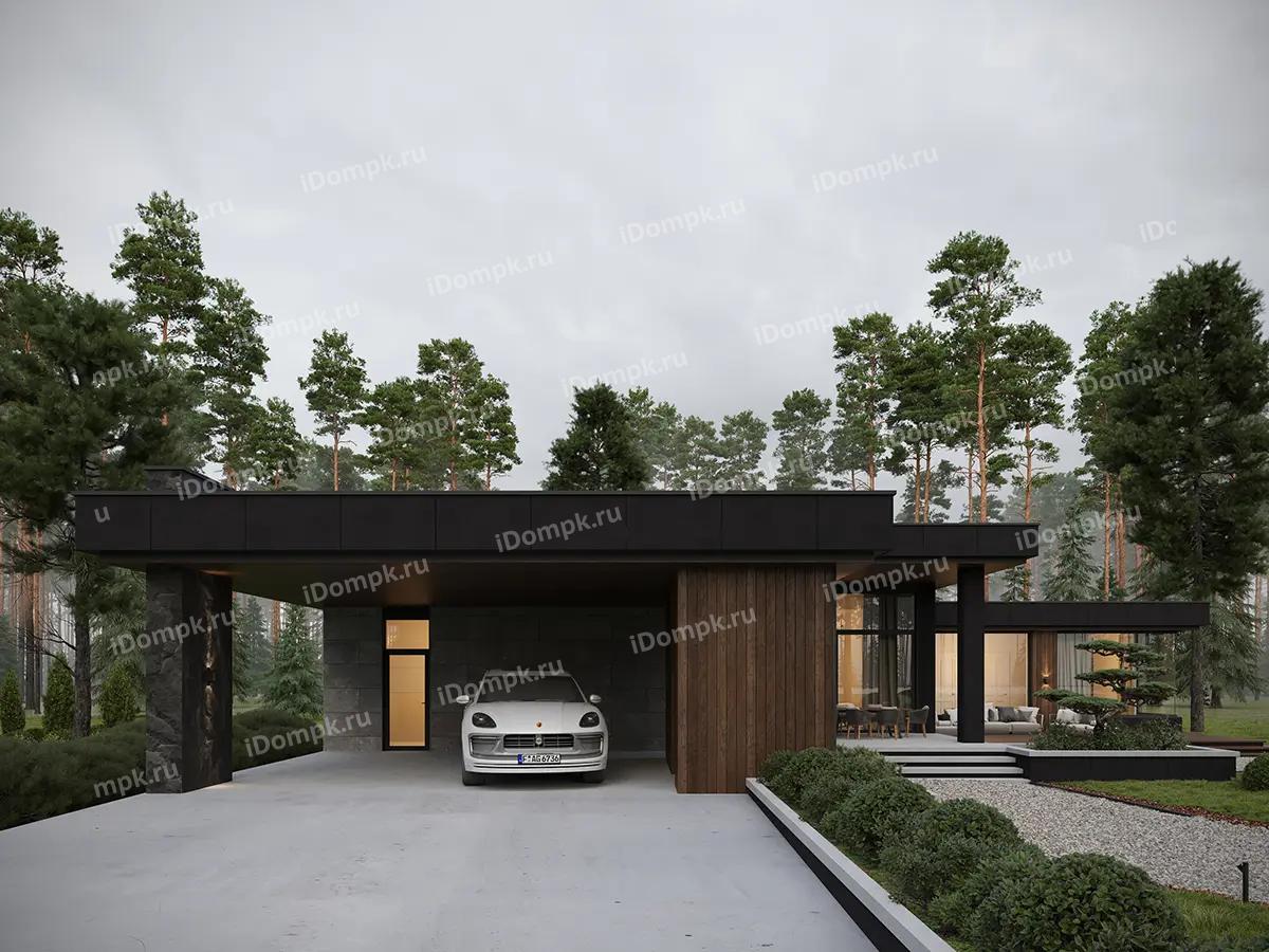 Проект одноэтажного углового дома с плоской крышей, сауной, 2 спальнями, кабинетом и навесом