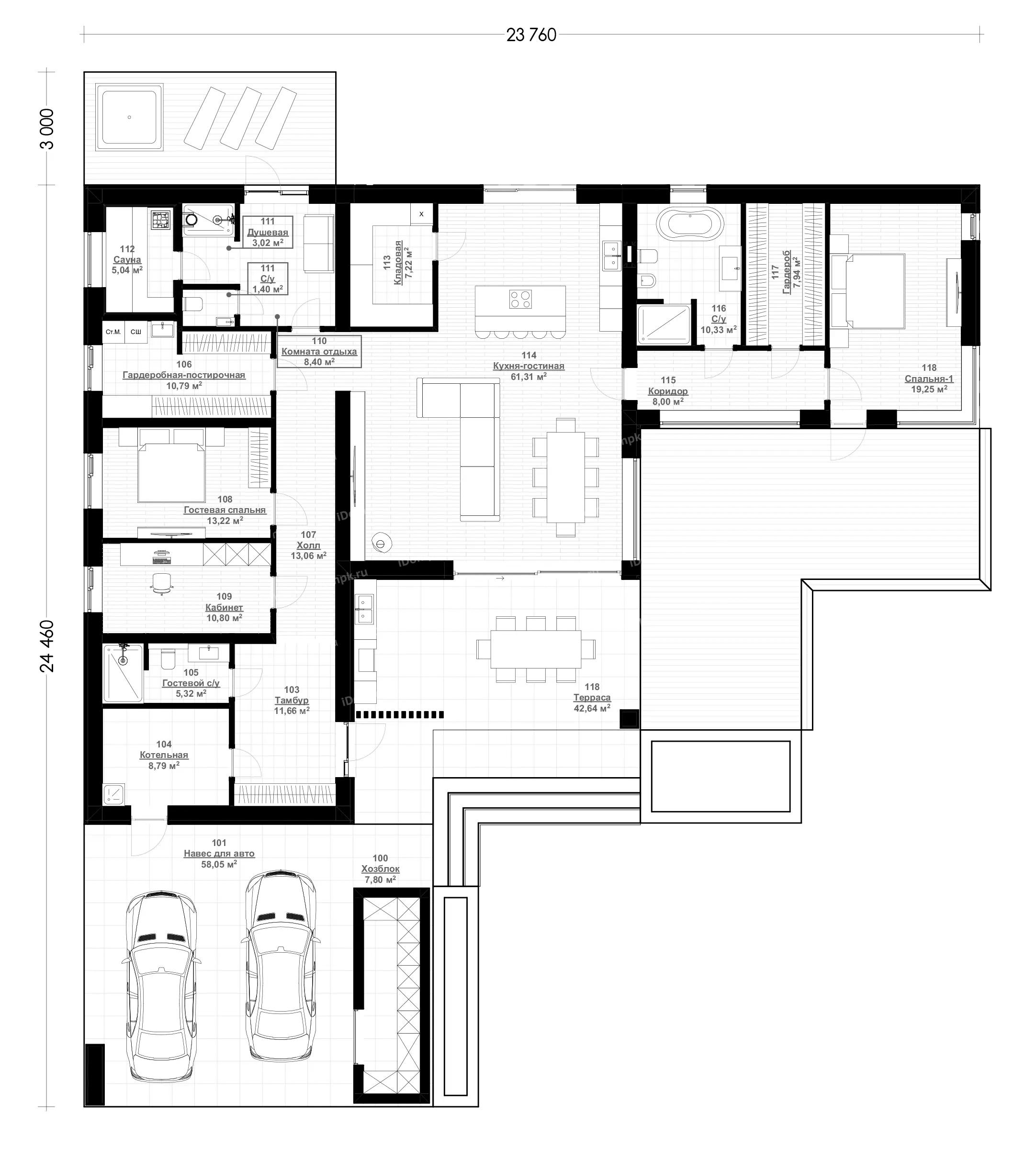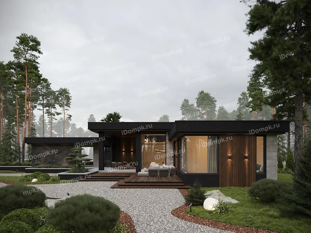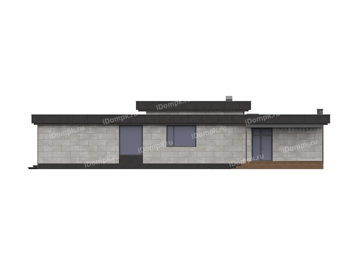 Проект одноэтажного углового дома с плоской крышей, сауной, 2 спальнями, кабинетом и навесом